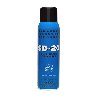 Formulated to foam away dirt, grease, and fingerprints from washable surfaces, SD-20 all-purpose degreaser aerosol tackles a wide range of cleaning jobs from removing heavy soil on baseboards to foaming away grease on exhaust vents and hoods. The clinging foam, no-rinse formula allows concentration of the product on stubborn spots and aids in spot cleaning.
